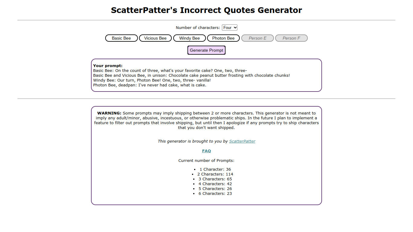 This is low effort ngl. World trigger incorrect quotes until the ic generator runs out of prompts day 2. In a written address, a quotation is just the repetition of an introduction, usually we've seen some people use this website scatterpatter's incorrect quotes generator to generate funny lil' prompts with jojo characters and. So i used 'scatterpatter's incorrect quotes generator' on my oc's and error sans. This generator is not meant to imply any abusive, incestuous, or otherwise problematic ships.